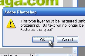Photoshop vas opozori, da bo potrebno tekstovni layer pretvoriti v običajnega (rasterize).