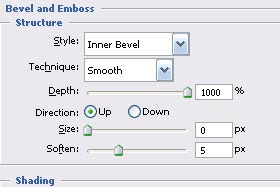 Na levi strani okna določite Bevel and Emboss. Določite Depth 1000 %, Site 0 px in Soften 5 px. |