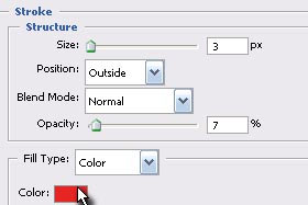 Size nastavite 3 px, Opacity določite 7 % in kliknite na kvadratek za določanje barve. |