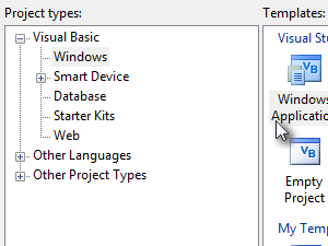 Tu izberemo, da bo program narejen v Visual Basic in bo narejen za Windows okolje. Izberemo Windows Application.