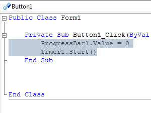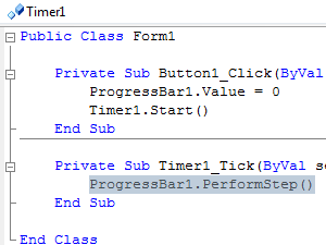 ProgressBar1.Value = 0 Timer1.Start() S prvo vrstico vedno postavimo ProgresBar na začetek. Z drugo vrstico sprožimo začetek delovanja časovnika. |