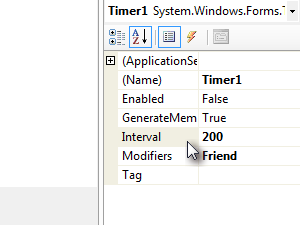 Privzeto se korak izvede na vsakih 100 milisekund oz. na 0,1s. Če želimo, da se vrstica nalaga dlje časa, lahko kliknemo na Timer1 in Interval spremenimo na večje število. |