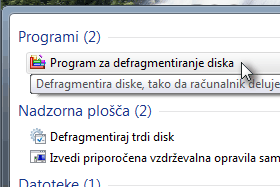 Med najdenimi zadetki izberemo Program za defragmentiranje diska.
