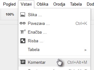 ![]() Sedaj odpremo meni Vstavi in izberemo možnost Komentar. |