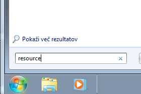 Kliknemo na gumb Start in v polje za iskanje vpišemo resource.