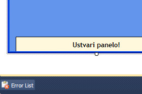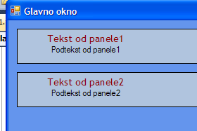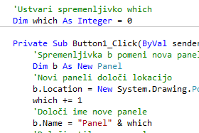 'Spremenljivka b pomeni nova panela Dim b As New Panel 'Novi paneli določi lokacijo b.Location = New System.Drawing.Point(12, (which * 62) + 12) which += 1 'Določi ime nove panele b.Name = "Panel" & which 'Določi stil nove panele b.BorderStyle = BorderStyle.FixedSingle 'Določi velikost nove panele b.Size = New System.Drawing.Size(317, 50) b.TabIndex = which + 2 'Določi barvo nove panele b.BackColor = Color.LightSteelBlue Me.Controls.Add(b) AddHandler b.Click, AddressOf deneme |