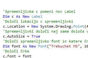 'Spremenljivka c pomeni nov Label Dim c As New Label 'Določi lokacijo c spremenljivki c.Location = New System.Drawing.Point(40, 4) 'Spremenljivki določi naj sama določa velikost (glede na tekst) c.AutoSize = True 'Določi spremenljivko font in katere črke so to Dim font As New Font("Trebuchet MS", 10, FontStyle.Regular) 'Določi črke c.Font = font 'Določi barvo c.ForeColor = Color.DarkRed 'Določi tekst c.Text = "Tekst od panele" & which AddHandler c.MouseMove, AddressOf altciz AddHandler c.MouseLeave, AddressOf altciz_kaldir 'Določi spremenljivko d kot nov Label Dim d As New Label 'Določi lokacijo d spremenljivke d.Location = New System.Drawing.Point(45, 22) 'Spremenljivki določi naj sama določa velikost (glede na tekst) d.AutoSize = True 'Določi tekst spremenljivke d.Text = "Podtekst od panele" & which b.Controls.Add(c) b.Controls.Add(d) c.Visible = True b.Visible = True |