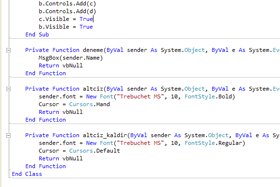 Private Function deneme(ByVal sender As System.Object, ByVal e As System.EventArgs) MsgBox(sender.Name) Return vbNull End Function Private Function altciz(ByVal sender As System.Object, ByVal e As System.EventArgs) sender.font = New Font("Trebuchet MS", 10, FontStyle.Bold) Cursor = Cursors.Hand Return vbNull End Function Private Function altciz_kaldir(ByVal sender As System.Object, ByVal e As System.EventArgs) sender.font = New Font("Trebuchet MS", 10, FontStyle.Regular) Cursor = Cursors.Default Return vbNull End Function Za večjo ločljivost kliknite tukaj. |