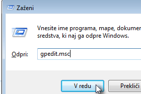 Vpišemo gpedit.msc in potrdimo s klikom na gumb V redu.