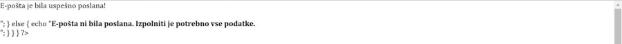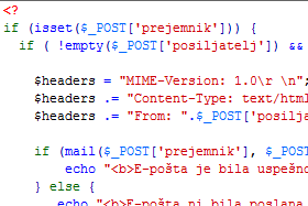 sasko.123: Sem še enkrat pregledal kodo in v njej res našel eno napako, kar je bil razlog, da v prvo ni nič izpisalo. Sem sedaj v lekciji popravil kodo. Sem pa preveril tudi na 000space.com in PHP res podpira. Vendar pa mora ponudnik podpirati tudi funkcijo mail() za pošiljanje pošte, kar pa zgleda, da ne tem gostovanju ni podprto. Nepodpora tej funkciji je drugače na brezplačnih strežnikih dokaj pogosta, saj se to velikokrat zlorablja za pošiljanje neželene elektronske pošte. |