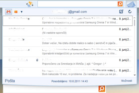 Račune upravljate s klikom na gumb Možnosti v predogledu nabiralnika. Levo zgoraj lahko preklapljate med različnimi računi in si tako ogledate sporočila v vseh nabiralnikih, brez da bi zapustili trenutno stran. Desno zgoraj se nahajata še gumba, ki omogočata: novo e-poštno sporočilo in osvežitev trenutnega pogleda nabiralnika. Videli pa boste tudi kdaj ste prejeli novo e-pošto in koliko jo je, če boste gumb za pošto seveda obdržali v vrstici in ste omogočili opozorila.