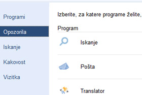 Pod Opozorila lahko izberete za katere funkcije želite prejemati samodejna opozorila (npr. za prevod strani v tujem jeziku).