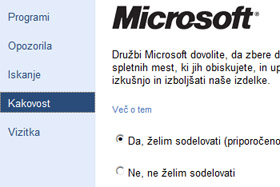 V zavihku Kakovost označite ali želite družbi Microsoft omogočiti zbiranje anonimnih podatkov o uporabi za izboljšanje uporabniške izkušnje. Priporočena opcija je Da, želim sodelovati.