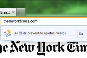Kadar pa boste obiskovali strani, ki niso v vašem jeziku, pa vam bo vrstica vedno ponudila prevajanje. Če pa se to ne zgodi (npr. če niste omogočili opozorila), kliknite na gumb Translator. Stran se prevede s pomočjo tehnologije Microsoft Translator.