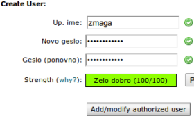 Spodaj nam cPanel prikaže stopnjo varnosti gesla, česar ste verjetno že navajeni. Na koncu kliknemo na Add/modify authorized user, da shranimo uporabnika. Kot vidimo se nam prikaže rubrika Authorized users:, kjer lahko odstranjujemo uporabnike. |