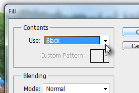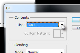 V novem oknu Use preko izbirnika določite Black in potrdite s klikom na gumb OK. S tem ukazom smo nov layer v celoti zapolnili s črno barvo. |