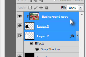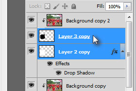 Označite vse tri zgornje layerje, tako da držite tipko Ctrl in klikate po njih. Potem pa kliknite na označete fotografije z desnim miškinim gumbom in izberite Duplicate layers. Ko se pojavi novo okno, kjer vas sprašuje za ime podvojenih layerjev, kliknite na gumb OK. |