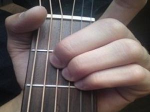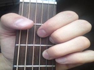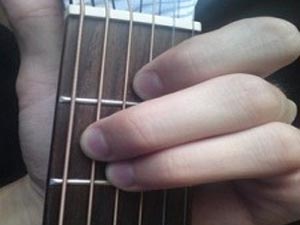 ![]() Akord A Kazalec: 2. polje, 2. struna Sredinec: 2. polje, 3. struna Prstanec: 2. polje, 4. struna Tudi pri tem akordu morate zadušiti zgornjo struno (glej sliko).