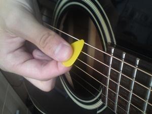 ![]() Ritem naj bo osnovni ritem za zabavno glasbo (4/4): D D G - GDG Pri čemer D pomeni strunanje dol, G strunanje gor, - pomeni daljša "pavza" in presledek pa pomeni kratka "pavzica". Za strunanje lahko uporabljate trzalico ali prste. Trzalica se praviloma drži samo s palcem in kazalcem.