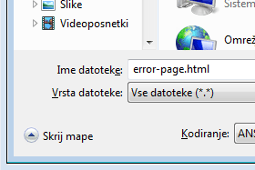 Za tiste, ki tega ne znate, sem napisal spodnji primer: <center> <title>Strani ni moč najti (404)</title> <h1>Strani ni moč najti (404)</h1> <br></br> <br>Strani, ki jo iščete ni bilo moč najti na tem strežniku.</br> <br></br> <br></br> <br></br> <br> <input type='button' value='Pojdite na prejšnjo stran' onClick='history.go(-1)'> </br> </center> Dokument shranite pod imenom error-page.html ob shranjevanju bodite pozorni, da shranite kot Vse datoteke (*.*) ( All files (*.*) ) |