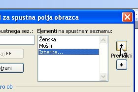 Potem v polju, kjer se nahajajo vsi trije elemeti, označite besedo Izberite... (ki ste jo prej dodali) in dvakrat kliknite na gumb za premik navzgor.