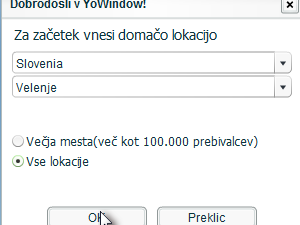Za začetek moramo vnesti domačo lokacijo. Meni je zaznalo Slovenijo in mesto Velenje.