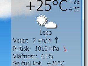 Na desni strani pa imamo podrobne podatke, kot so veter, pritisk, vlažnost, občutek temperature kot tudi sama temperatura.