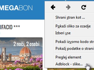 ![]() Odpremo neko poljubno spletno stran, na kateri se nahajajo reklame. Z desnim miškinim gumbom kliknemo na reklamo, ki jo želimo za vedno odstraniti in izberemo možnost Adblock - slike... |