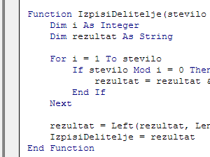 ![]() Pripravil sem še eno funkcijo, ki poišče vse delitelje nekega števila: Function IzpisiDelitelje(stevilo As Integer) As String Dim i As Integer Dim rezultat As String For i = 1 To stevilo If stevilo Mod i = 0 Then rezultat = rezultat & i & ", " End If Next rezultat = Left(rezultat, Len(rezultat) - 2) IzpisiDelitelje = rezultat End Function |