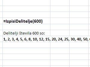 ![]() Ko program poišče vse večkratnike, mora odstraniti še odvečno vejico, ki se pojavi na koncu. rezultat = Left(rezultat, Len(rezultat) - 2) Za konec pa mora vse večkratnike še poslati Excelu kot rezultat celotne funkcije. IzpisiVeckratnike = rezultat |