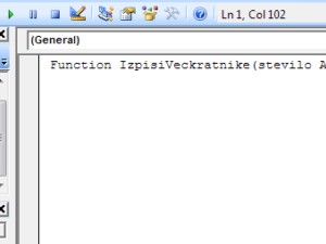 ![]() Odprlo se nam je prazno okno za vpis programske kode. Začeli bomo na začetku. Vpišite Function IzpisiVeckratnike (stevilo As Integer, Optional steviloVeckratnikov As Integer = 5) As String Tej naši funkciji bo, kot vidite, ime IzpisiVeckratnike. Prvi argument je obvezen in tukaj bomo kasneje lahko vpisali, večkratnike katerega števila želimo. Drugi argument - steviloVeckratnikov - ne bo obvezen, saj bo kot privzeto določeno, naj Excel izpiše 5 večkratnikov.
