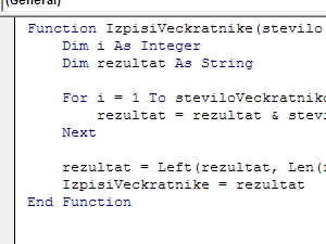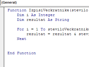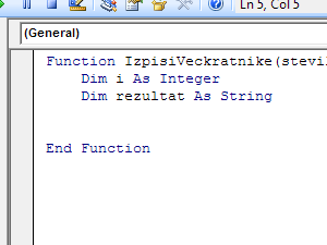 ![]() Pritisnite Enter in samodejno se vam bo vstavilo End Function. To označuje konec funkcije. Sedaj vmes zapišite Dim i As Integer Dim rezultat As String S tem bomo rezervirali dve spremenljivki, prva bo uporabljena za računanje, v drugo pa bomo shranjevali vse večkratnike.