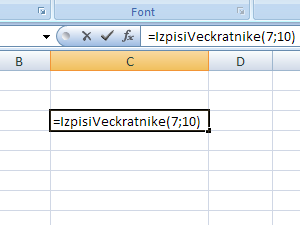 ![]() To formulo lahko sedaj uporabimo kot vsako drugo. Vnesite torej naslednje: =IzpisiVeckratnike(7;10) Pritisnite Enter.