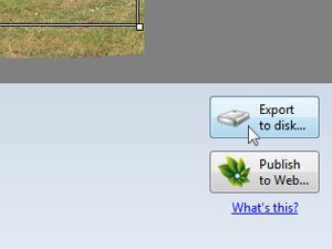 ![]() Na desni izberite gumb Export to disk..., če želite panoramo shraniti kot običajno fotografijo. Z Raziskovalcem izberite, kam želite panoramo shraniti in jo poljubno poimenujte. Shranjevanje lahko traja malo dlje, kot pri običajnih fotografijah. Lahko pa jo tudi naložite v storitev Photosynth, če izberete Publish to Web... Več o storitvi Photosynth tukaj.