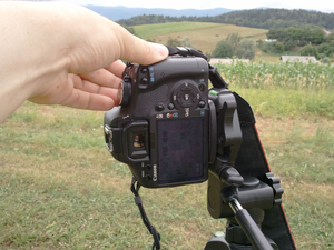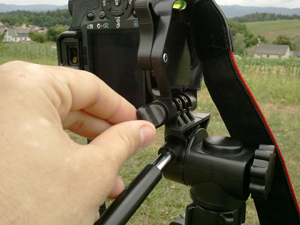 ![]() Ko ste našli čudovito pokrajino za fotografiranje panorame, postavite stojalo in nanj namestite fotoaparat. Poskrbite, da bo stojalo stabilno stalo in so vsi vijaki priviti, da se fotoaparat ne bo premikal. Odvijte vijak (ponavadi na glavi stojala, tik pod fotoaparatom, ki je nameščen nanj), da boste fotoaparat lahko obrnili v portretni način in nato vijak spet privijte, da se fotoaparat ne prevrne nazaj. Fotografirali bomo v pokončnem načinu, saj se bodo tako robovi fotografij manj popačili, potrebovali pa bomo tudi več fotografij in nastala bo boljša panorama.