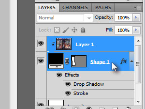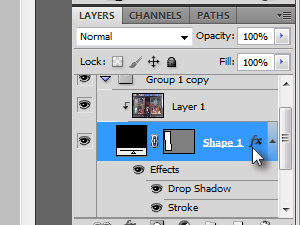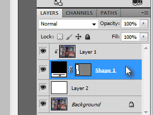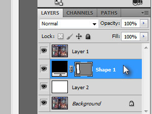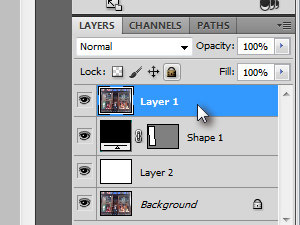 ![]() Sedaj pa držite tipko Ctrl in z miško označite zgornji layer z duplicirano fotografijo in layer pod njim, ki predstavlja obliko (glej sliko). |