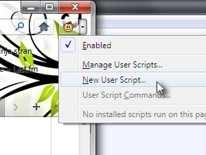 V zgornjem desnem delu Firefox-a poiščemo ikono opice in kliknemo puščico ob njej. Izberemo New User Script. |