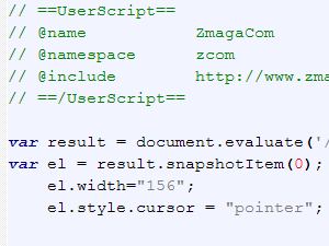 var result = document.evaluate('/html/body/table[2]/tbody/tr/td[3]/table/tbody/tr/td', document, null, 7, null); var el = result.snapshotItem(0); el.width="156"; el.style.cursor = "pointer"; var newEl = document.createElement("img"); newEl.src = "slike/navigacija_vse.gif"; newEl.addEventListener('click', prikaziVse, false); el.appendChild(newEl); function prikaziVse() { var result = document.evaluate('/html/body/table[2]/tbody/tr/td[3]/table[2]/tbody/tr[3]/td/child::*', document, null, 5, null); var links = new Array(); var lll = new Array(); var i = 0; var el; var node = result.iterateNext(); var found = false; while(!found) { if (i==0) { links[i] = node.children[0].children[0].children[1].children[0].children[0].href; } else { links[i] = node.children[0].children[1].children[1].children[0].children[0].href; if(node.children[0].children[0].children[0].childNodes.length>2) { found = true; break; } } i++; node = result.iterateNext(); } if(links.length>30) {alert("Ni novih objav!")} else { for (i=0;i<=links.length-2;i++) { window.open(links[i], '_blank', ''); } } } |