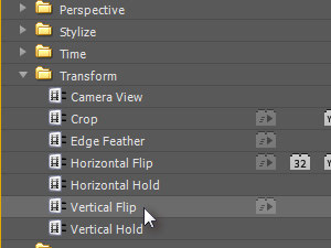 V okno Effect Controls povlecite še Vertical Flip, ki ga najdete v oknu Effects, Video Effect in Transform.