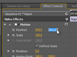 Sedaj pa v oknu Effect Controls odprite možnosti Motion in znižajte postavitev napisa tako, da spreminjate drugo vrednost Position, ki predstavlja višino (glej sliko) ... |