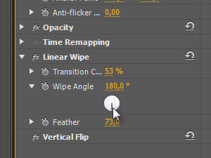 Odprite sedaj polje Linear Wipe in nastavite Wipe Angle na 180 stopinj ter spreminjajte vrednost Transition Center ter Feather toliko časa, dokler ne bo preliv na končnem izdelku všečen. |