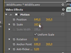 ![]() V oknu Video Effects odprite Motion in Scale povčajte vrednost za dve tretjini (glej sliko). |