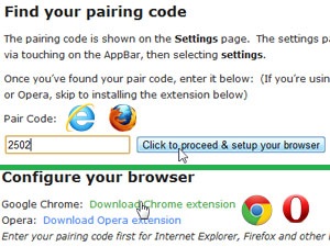 Če uporabljate Google Chrome ali Opero preprosto kliknite na povezavo Download Chrome/Opera extension in v brskalnik namestite razširitev. Če pa uporabljate Internet Explorer ali Mozilla Firefox boste pred tem morali vpisati še Pair code (glejte 3. korak).