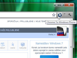Spet odprite aplikacijo Send to WP7 na telefonu. Program Send to WP7 Desktop lahko ostane zaprt, saj za to opravilo ne bo potreben. V brskalniku kliknite na ikono nameščene razširitve.