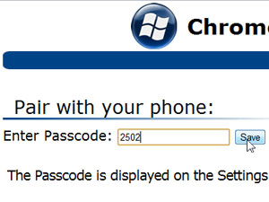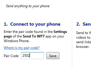 To kodo vpišite v okence Pair code v programu Send to WP7 Desktop na vašem računalniku in kliknite na gumb Save.