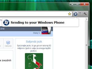 Razširitev v brskalniku pošlje povezavo v telefon tako da je povezava na voljo v aplikaciji Send to WP7. Ko kliknete nanjo, vam stran odpre v Internet Explorerju. Glejte 7. korak.