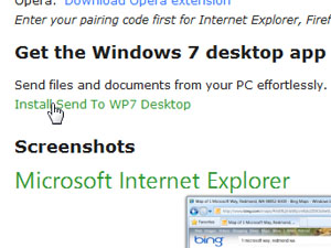 Potem na računalniku odprite to spletno stran. Kliknite na povezavo Install Send to WP7 Desktop, da prenesete in namestite program na vaš računalnik.