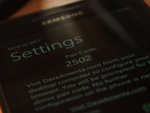 Sedaj bo potrebno telefon povezati z njim. Odprite Send to WP7 aplikacijo na telefonu, tapnite na tri pikice v desnem spodnjem kotu, da se odpre meni in izberite settings. Tukaj vidite Pair code, ki pripada vašemu Windows Phonu.