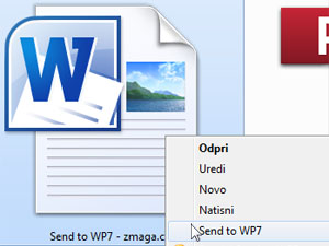 Poiščite nek dokument, ki bi ga radi shranili v telefon ali pa si ga tam samo ogledali. Kliknite nanj z desno miškino tipko in izberite Send to WP7. Program Send to WP7 Desktop na računalniku mora biti odprt, da bo opcija na voljo v kontekstnem meniju. Prav tako mora biti v telefonu zagnana aplikacija Send to WP7.