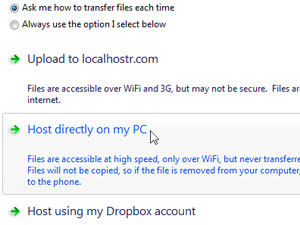 Če boste pustili označeno Ask me how to transfer files each time se bo to okno pojavilo vedno, ko boste želeli prenesti datoteko v telefon. V primeru da izberete Always use the option I select below pa bo vedno uporabljen tak način prenosa, kot ga boste izbrali tokrat, okno pa se ne bo več pojavljalo. • Upload to localhostr.com - datoteke bodo naložene na splet, a morda ne bodo varno shranjene, telefon pa je lahko povezan preko Wi-Fi ali mobilnega omrežja • Host directly on my PC - računalnik in telefon morata biti povezana v isto omrežje - Wi-Fi, datoteka pa ne bo nikamor prenesena oz. naložena, ampak bo dostopna direktno iz vašega računalnika; priporočam to možnost, ki bo uporabljena tudi v nadaljevanju • Host using my Dropbox account - če uporabljate storitev Dropbox lahko uporabite to možnost, datoteke pa bodo kopirane v vašo mapo in bodo na telefonu na voljo ne glede na izbiro omrežne povezave - Wi-Fi ali 3G